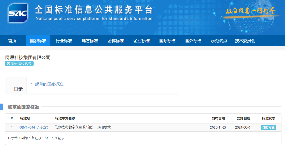 11月27日,国家市场监督管理总局、国家标准化管理委员会批准发布了《信息技术 数字孪生 第1部分:通用要求》,该标准将于2024年6月1日起正式实施。网思科技作为起草单位之一,深度参与此项标准的制定,与安世亚太、腾讯云和阿里巴巴等企业共同填补数字孪生国家标准体系的空白。图为468项推荐性国家标准公告文件在一众行业技